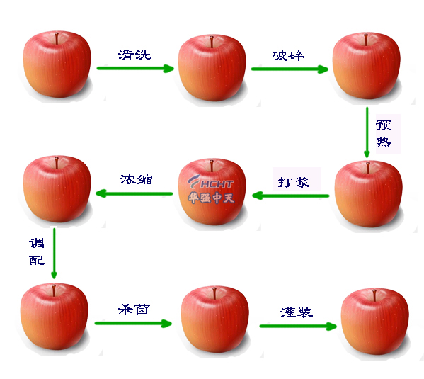 苹果—洗果—检果—破碎—灭酶—榨汁—过滤—杀菌—冷却—离心分离—澄清—过滤—杀菌—无菌灌装—贴标—喷码—包装