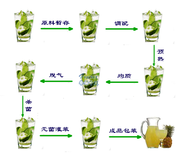 原料暂存—水处理 — 调配 — 脱气 —均质— 缓存 — 杀菌— 灌装 — 成品包装